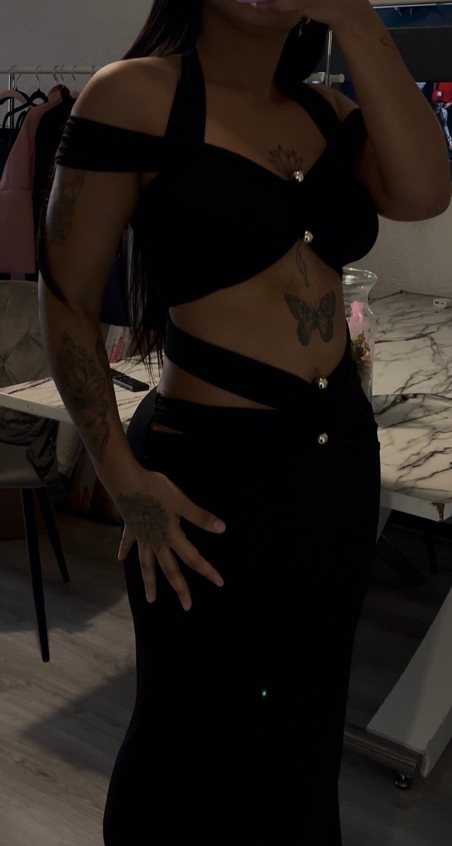 Deze zwarte, tweedelige maxi-set is het toonbeeld van moderne, sexy glamour. De set bestaat uit een halter/bardot crop top met een ruches detail en een nauwsluitende maxi-rok met een fishtail (zeemeermin) zoom. De rok is voorzien van opvallende, strategische cut-outs en plooien in de taille die zorgen voor een dramatische zandloper-look. Ideaal voor clubavonden, black-tie evenementen of als gast op een huwelijk met een dresscode.